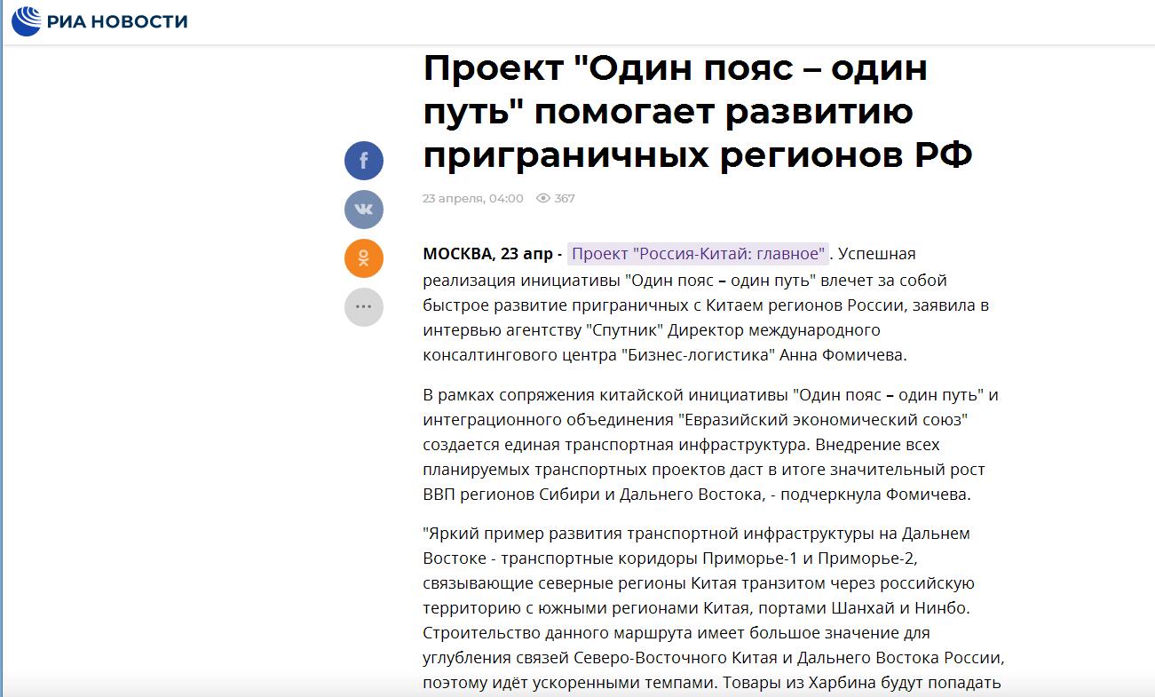 俄新網刊登中央廣播電視總臺評論《“一帶一路”倡議助力中俄邊境地區(qū)發(fā)展》