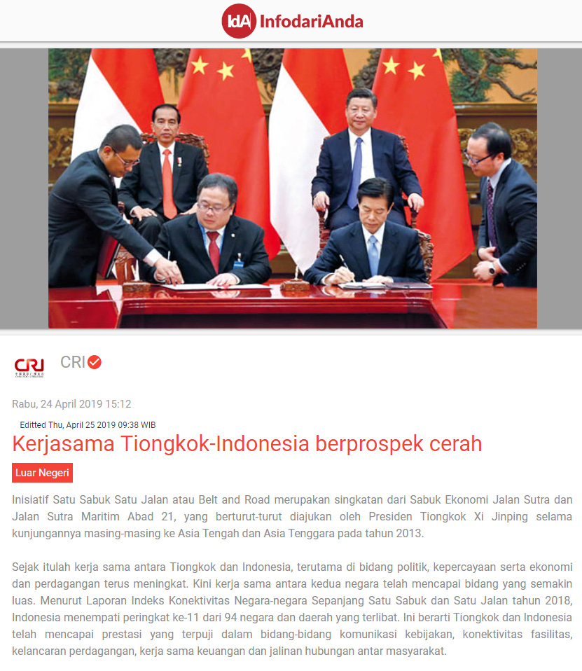 印尼艾爾辛達電臺網站刊登總臺印尼語評論《“一帶一路”利好印尼經濟 雙邊合作前景廣闊》