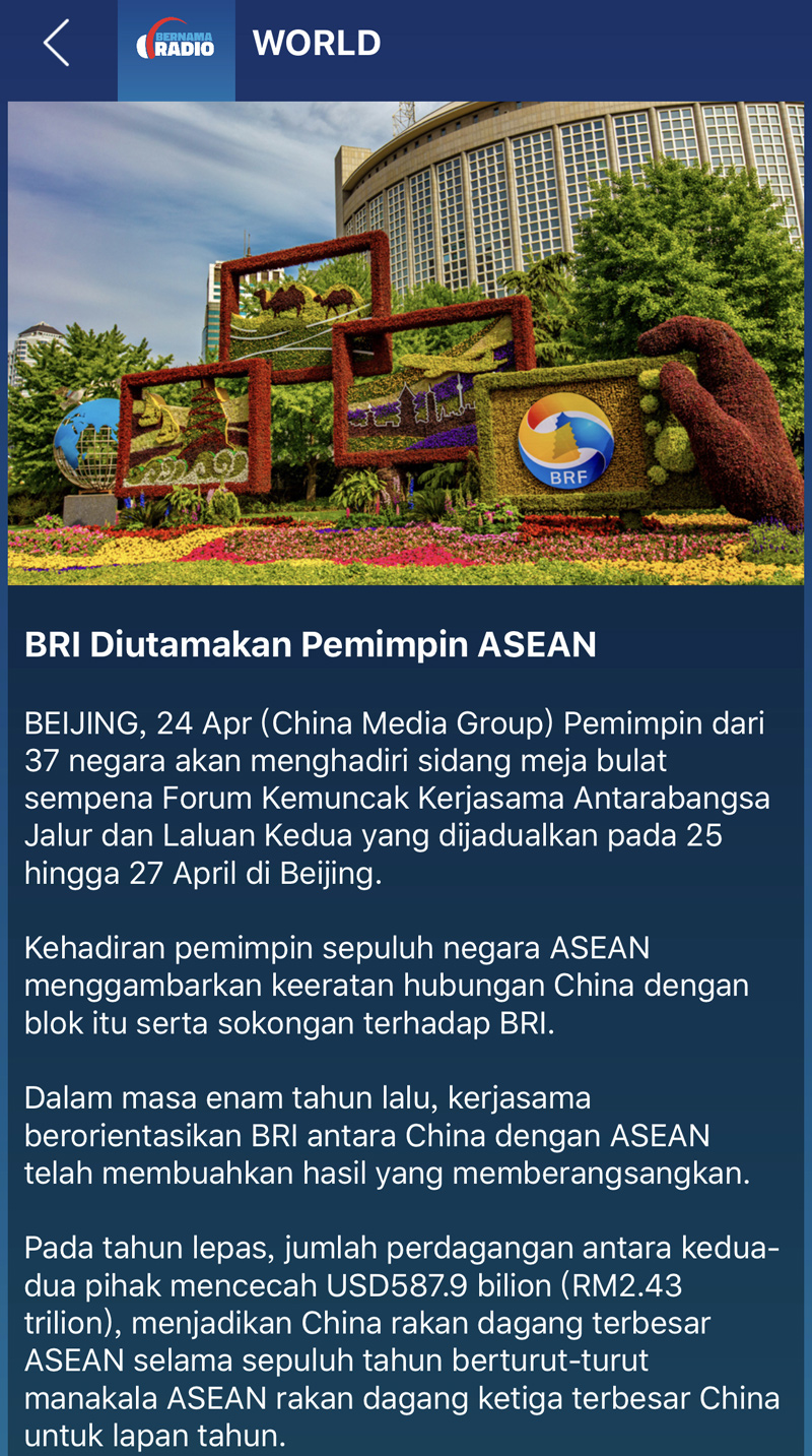 馬來西亞馬新社電臺新聞客戶端刊載總臺馬來語評論《東盟十國領導人高度重視“一帶一路”》