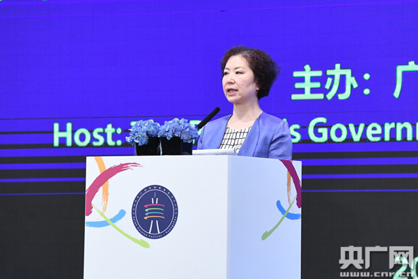廣東省委宣傳部常務(wù)副部長(zhǎng)、省電影局局長(zhǎng)白潔女士在開(kāi)幕式上致辭。(攝影:蘇韻樺)
