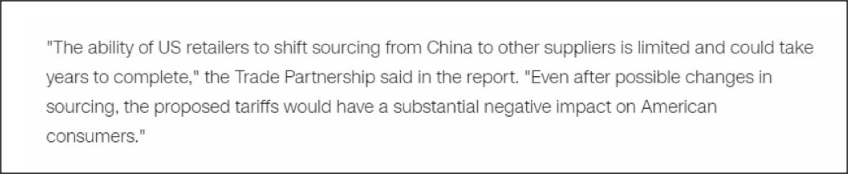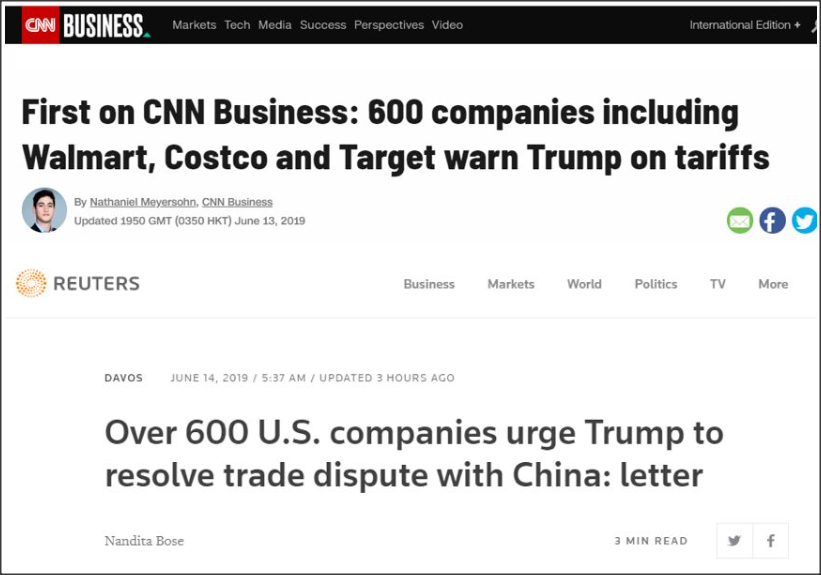據(jù)英國路透社和美國CNN報道,包括美國最大零售商沃爾瑪,以及Costco、Target、Gap、Levi Strauss、Foot Locker在內(nèi)的600多家美國企業(yè)已經(jīng)聯(lián)名給特朗普上書,要求他停止與中國的貿(mào)易爭端,因為這已經(jīng)損害到這數(shù)百家美國企業(yè)和美國消費者的利益。