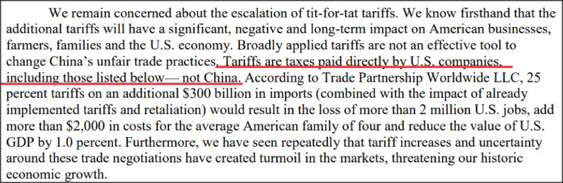 “這些關(guān)稅是直接由美國企業(yè)支付的稅金,而不是中國”,這些企業(yè)在信中寫道,“我們深知這些關(guān)稅將會給美國的企業(yè)、農(nóng)民、家庭以及美國經(jīng)濟帶來重大的、負(fù)面的長久的沖擊”。