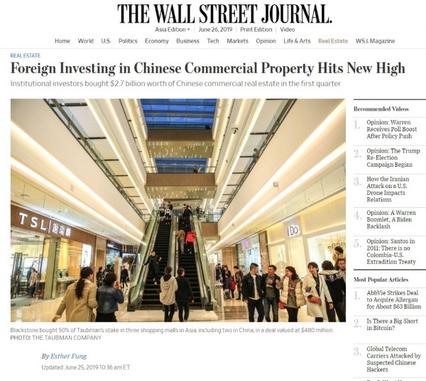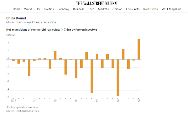外資對(duì)中國(guó)商業(yè)地產(chǎn)投資創(chuàng)新高。圖片來(lái)源:《華爾街日?qǐng)?bào)》報(bào)道截圖