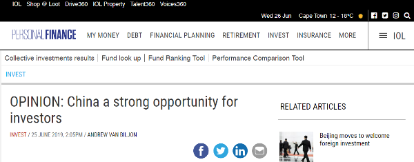 另?yè)?jù)南非獨(dú)立新聞網(wǎng)6月25日?qǐng)?bào)道,南非金融機(jī)構(gòu)RisCura分析師安德魯·范比利翁(Andrew van Biljon)認(rèn)為,盡管中美貿(mào)易關(guān)系持續(xù)緊張,但中國(guó)政府的政策和積極的市場(chǎng)變化,能夠確保投資中國(guó)是一個(gè)良機(jī)。