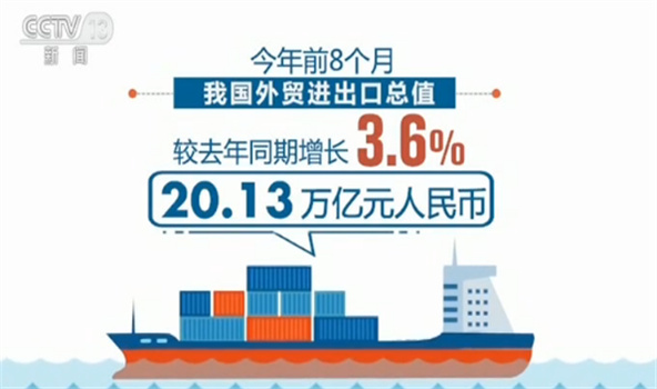 海關(guān)統(tǒng)計顯示,今年前8個月,我國外貿(mào)進出口總值20.13萬億元人民幣,較去年同期增長3.6%,其中出口10.95萬億元,同比增長6.1%,進口9.18萬億元,同比增長0.8%。