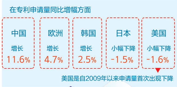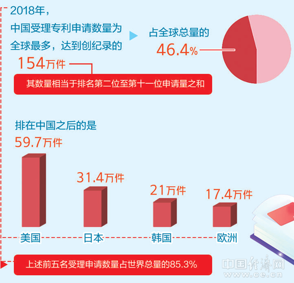 報告顯示,中國專利申請數(shù)量繼續(xù)在全球領(lǐng)先。2018年,中國受理專利申請數(shù)量為全球最多,達到創(chuàng)紀錄的154萬件,占全球總量的46.4%,其數(shù)量相當于排名第二位至第十一位申請量之和。排在中國之后的是美國(59.7萬件)、日本(31.4萬件)、韓國(21萬件)和歐洲(17.4萬件),上述前五名受理申請數(shù)量占世界總量的85.3%。