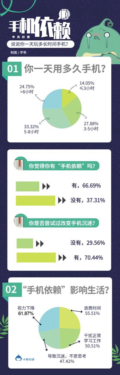 中青校媒調(diào)查顯示,62.69%被調(diào)查者認(rèn)為自己過度依賴手機。被調(diào)查者中,80.75%的人認(rèn)為,長時間使用手機是浪費時間,最好可以適度使用。