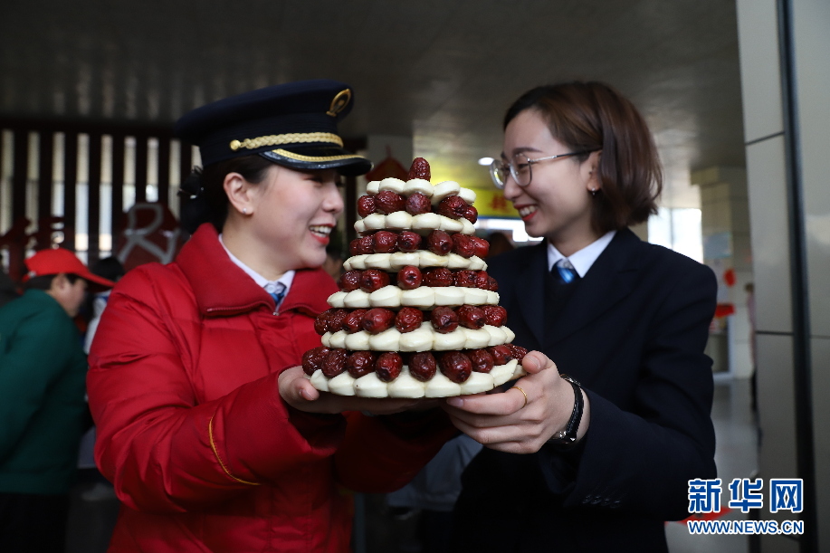 候車旅客邊吃棗糕邊感受中國的傳統(tǒng)習(xí)俗