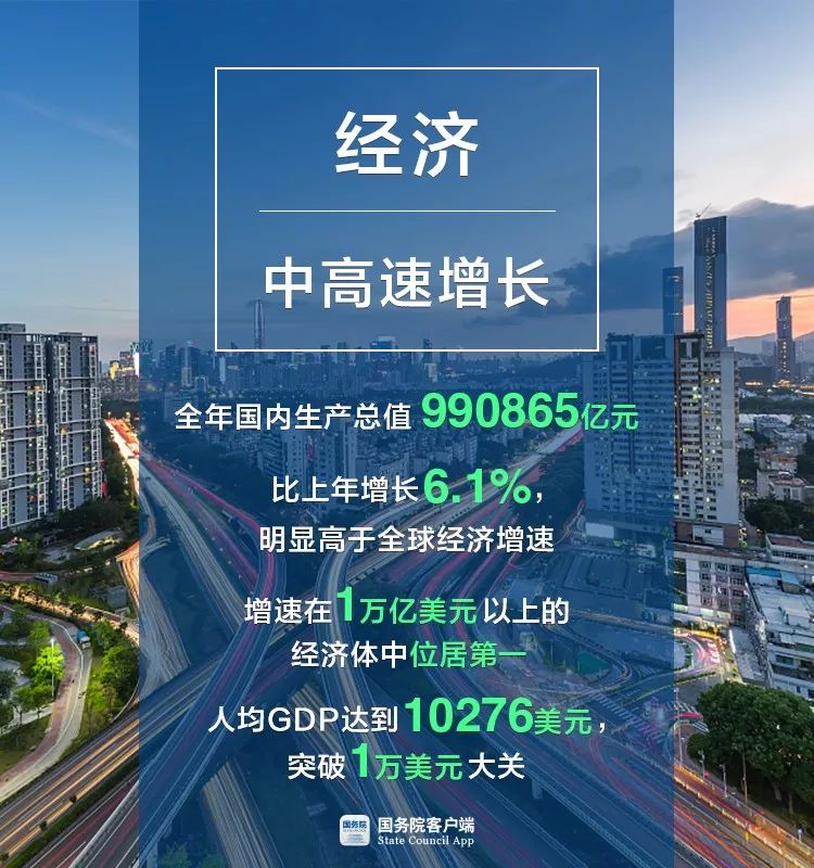 國(guó)家統(tǒng)計(jì)局1月17日上午公布2019年國(guó)民經(jīng)濟(jì)運(yùn)行情況數(shù)據(jù),初步核算,全年國(guó)內(nèi)生產(chǎn)總值990865億元,年末中國(guó)大陸總?cè)丝?40005萬(wàn)人,人均國(guó)內(nèi)生產(chǎn)總值10276美元,經(jīng)濟(jì)運(yùn)行總體平穩(wěn),發(fā)展主要預(yù)期目標(biāo)較好實(shí)現(xiàn)。2019中國(guó)經(jīng)濟(jì)有哪些特點(diǎn)?一起來(lái)看——