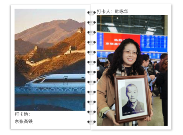 “我叫韓詠華,我爺爺韓魁元是修筑京張鐵路的第一代鐵路工人,他親眼見證了京張鐵路的建成。一百年前,京張鐵路時速只有35公里,而一百年后的今天,京張高鐵時速已達350公里,這樣安全、便捷的高鐵列車,別說普通百姓,就是詹天佑先生做夢都想不到。我爺爺在世時就希望京張鐵路變得越來越好,如今京張高鐵剛開通就迎接春運的‘檢閱’,我要‘抱著他’坐上這趟高鐵,一起見證這一光榮時刻。”打卡人韓詠華說。