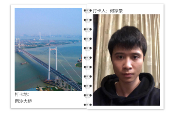 “我叫何家豪,老家在佛山,目前在深圳一家機器人公司工作。以前春節(jié)只能從虎門大橋回家,‘逢走必堵’。若想避開擁堵,就需要起個大早或者深夜出發(fā),F(xiàn)在南沙大橋開通后,說走就走,兩個小時就能到家。近幾年,競技格斗機器人行業(yè)愈加繁榮,我們團隊每次外出參加比賽,都會從南沙大橋經(jīng)過,有種南沙大橋送我‘出征’的感覺,這種感覺很奇妙!”打卡人何家豪說。