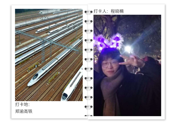 “我叫程曉楠,是湖南工業(yè)大學(xué)研一的學(xué)生。從湖南株洲到河南平頂山的直達列車很少,每次路上都得折騰一天一夜,回一次家,整個人都精疲力盡的。鄭渝高鐵鄭襄段開通了,以前3小時的路程,現(xiàn)在47分鐘就能到平頂山,很方便,所以坐高鐵成了我的第一選擇! 打卡人程曉楠說。