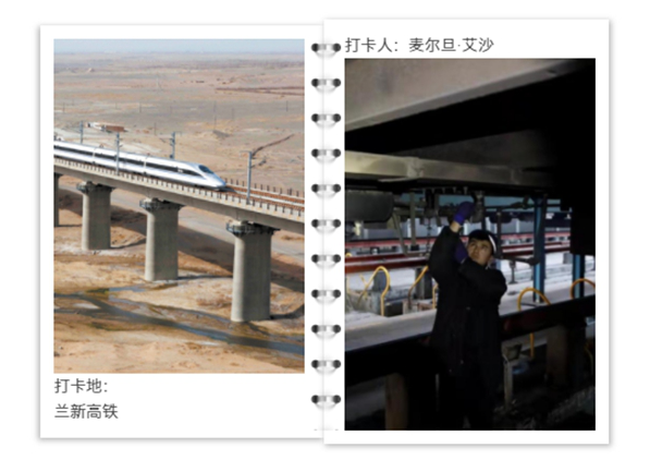 “我叫麥爾旦·艾沙,是中國鐵路烏魯木齊局集團有限公司烏魯木齊車輛段的一名‘00后’職工,日常工作是對入庫的車體進行檢查和維修,確保車輛安全、平穩(wěn)地運行。對每個螺絲我都擰得特別認(rèn)真,現(xiàn)在火車速度越來越快了,對檢修的要求特別高,修車人要時刻想著坐車人。今年是我參加工作的第一年,我最大的愿望就是帶著爸媽坐上我檢修的火車去上海旅游,讓爸媽為我驕傲!希望更多維吾爾族兄弟姐妹坐著我檢修的列車走出去看看!”打卡人麥爾旦·艾沙說。