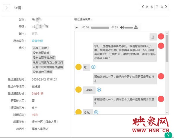 映象網(wǎng)訊(記者 陳偉然 通訊員 郝少川 孫艷麗)在抗疫一線,人工智能為社區(qū)疫情防控提效降本提供了新的思路。疫情防控進入艱難時期,隨著復工潮的到來,更多的人員流動給社區(qū)疫情防控排查及居家隔離監(jiān)控帶來新挑戰(zhàn)。鄭州市二七區(qū)建中街街道辦事處率先使用AI人工智能外呼平臺,實現(xiàn)對居家隔離人員的二次排查、隔離監(jiān)控、宣教提醒,有效加強了街道疫情防控工作力量,提高了防控工作效率。