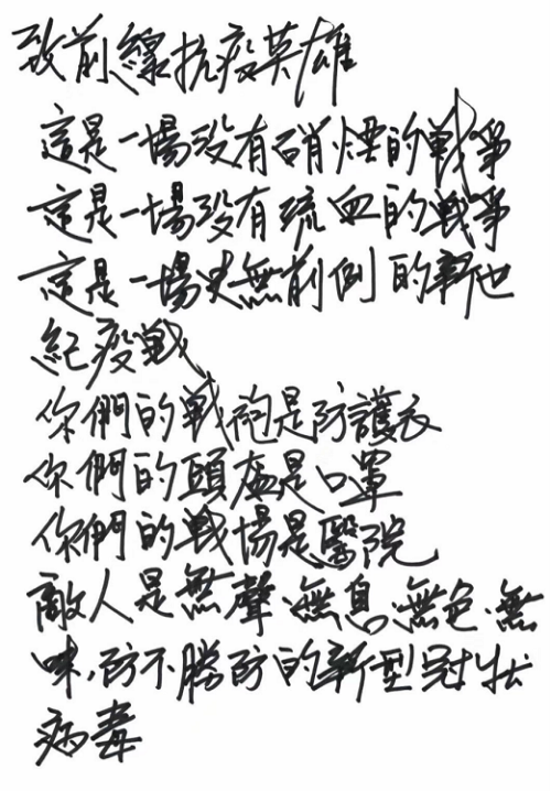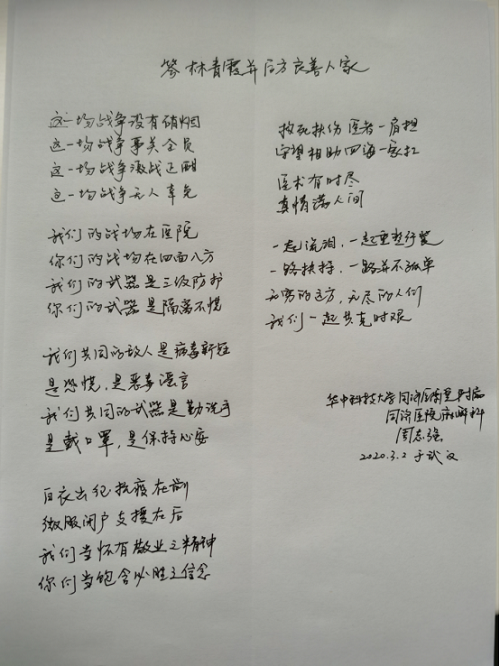 看到這封青霞手書,同濟(jì)醫(yī)院麻醉科的周志強(qiáng)醫(yī)生,也寫了一首詩,作為回應(yīng)。