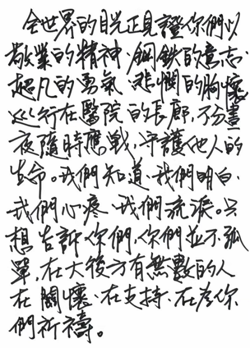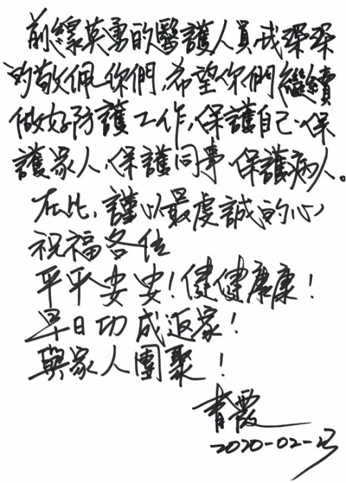 3月初,華中科技大學(xué)同濟(jì)醫(yī)學(xué)院附屬同濟(jì)醫(yī)院收到了一份捐助,共計2000副醫(yī)用手套,還有一封用繁體字書寫的信,署名是青霞。