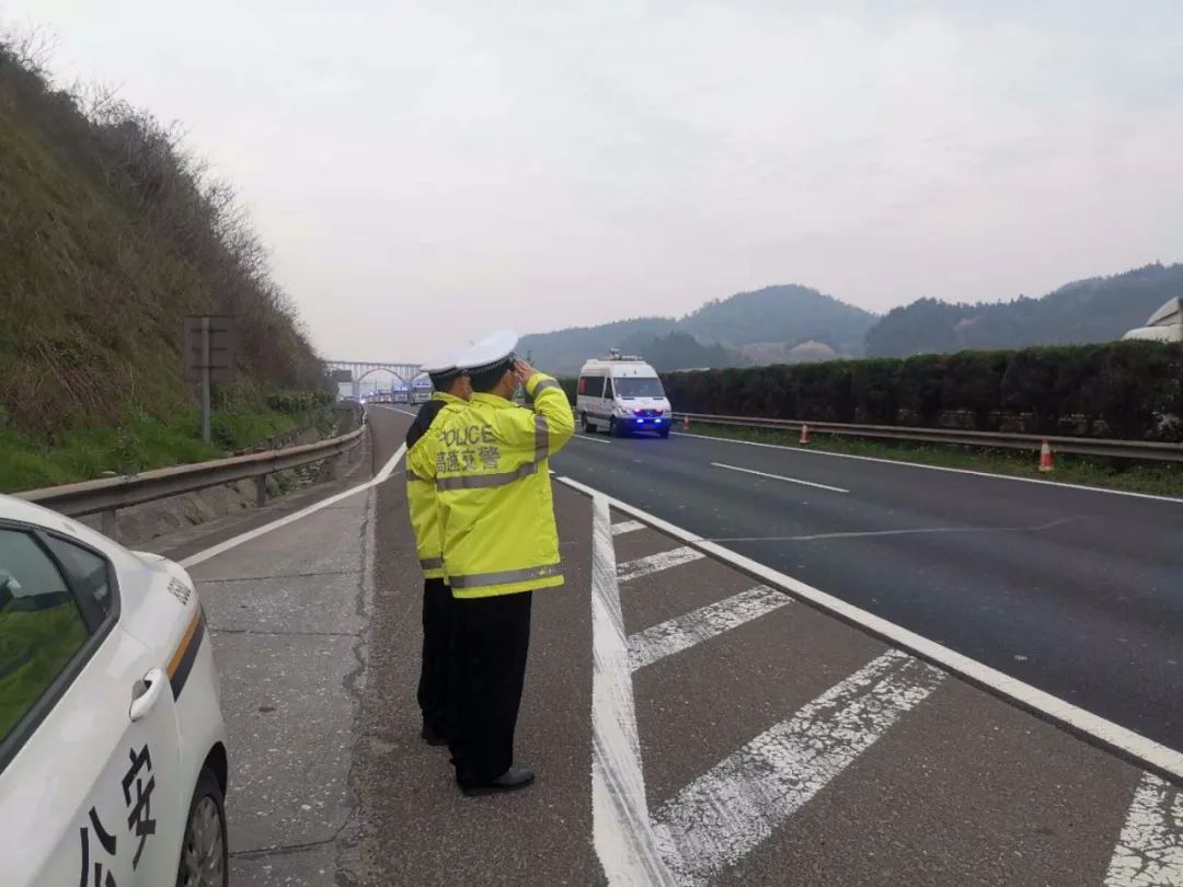 在寧夏緊急醫(yī)學(xué)救援隊(duì)車(chē)輛返回沿途,湖北省高速交警警車(chē)護(hù)航,民警列隊(duì)敬禮,車(chē)輛鳴笛致意。