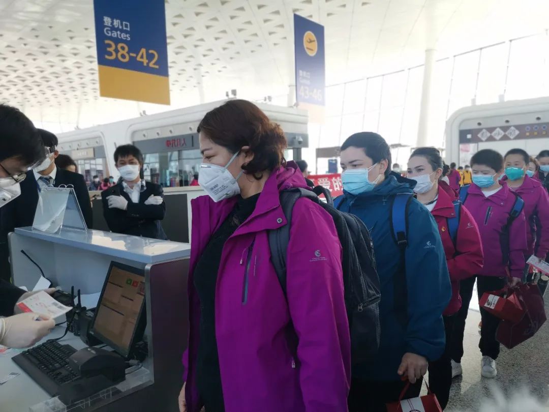 新疆援漢醫(yī)療隊(duì)在登機(jī)口檢票登機(jī)
