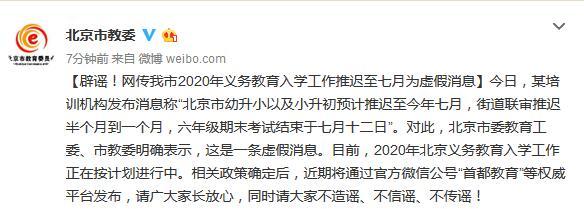 據北京市教育委員會官方微博消息,今日,某培訓機構發(fā)布消息稱“北京市幼升小以及小升初預計推遲至今年七月,街道聯(lián)審推遲半個月到一個月,六年級期末考試結束于七月十二日”。對此,北京市委教育工委、市教委明確表示,這是一條虛假消息。
