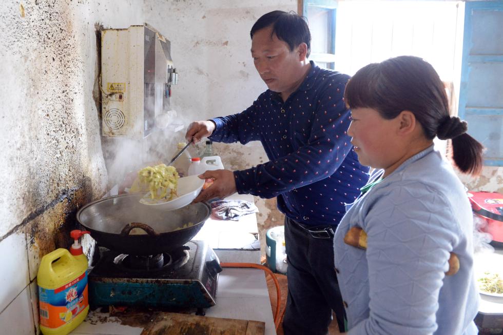 ↑4月2日,孫勇和妻子在廚房做午飯。