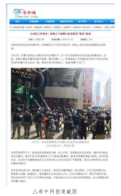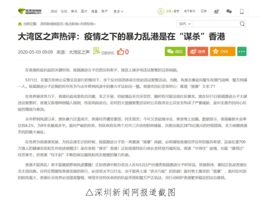 中央廣播電視總臺“大灣區(qū)之聲”5月3日刊播題為《大灣區(qū)之聲熱評:疫情之下的暴力亂港是在“謀殺”香港》的評論文章,對香港極端激進分子在疫情之下仍然沒有收手,一再上演違法聚集、暴力亂港的丑惡鬧劇進行揭露和批判。文章播發(fā)后受到廣泛關注,并迅速被眾多境內外媒體、網(wǎng)站、微博、客戶端轉載、引用。