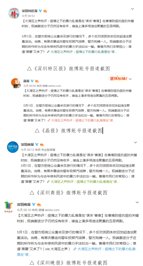 深圳特區(qū)報、晶報、深圳商報、深圳晚報等媒體微博賬號也廣泛轉載了這篇熱評文章,一致認為,在疫情防控最關鍵最緊張的時刻,極端激進分子若一再重演“黑暴”鬧劇,必將摧毀香港經(jīng)濟僅存的復蘇希望,變相“謀殺”香港。