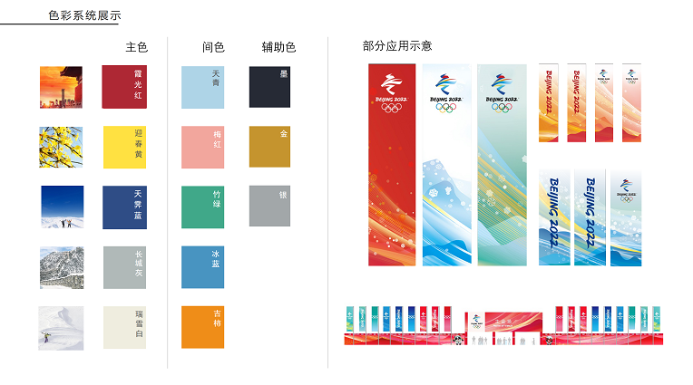 經(jīng)過對(duì)中國歷史上代表性色彩的挖掘,對(duì)中國色彩文化的提煉以及對(duì)北京、延慶和張家口三個(gè)賽區(qū)城市色彩的分析,設(shè)計(jì)了北京2022年冬奧會(huì)和冬殘奧會(huì)色彩系統(tǒng),