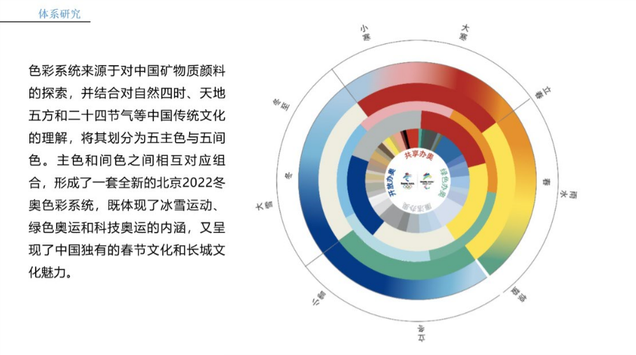 四是,色彩系統(tǒng)來源于對(duì)自然四時(shí)、天地五方和二十四節(jié)氣等中國傳統(tǒng)文化的理解,將其劃分為五主色與五間色。主色和間色之間相互對(duì)應(yīng)組合,形成了一套全新的北京2022冬奧色彩系統(tǒng),既體現(xiàn)了冰雪運(yùn)動(dòng)、綠色奧運(yùn)和科技奧運(yùn)的內(nèi)涵,又呈現(xiàn)了中國獨(dú)有的春節(jié)文化和長(zhǎng)城文化魅力。