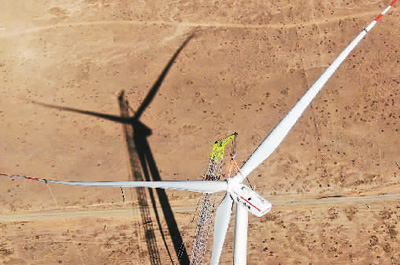 圖為5月1日,在青海省海南州共和縣的國家電投黃河公司風(fēng)力發(fā)電項(xiàng)目建設(shè)現(xiàn)場,風(fēng)力發(fā)電機(jī)組在吊裝。