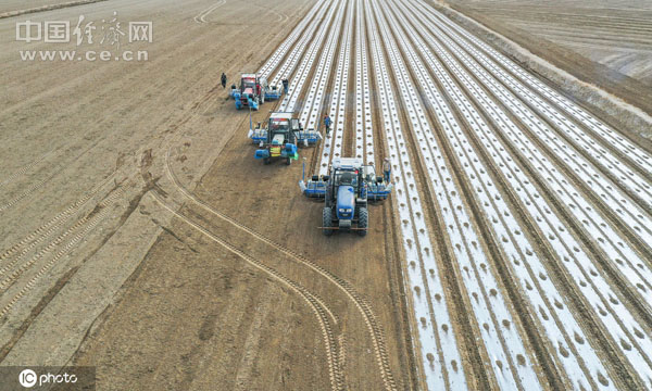 2020年4月1日,無人駕駛GPS衛(wèi)星導航播種機在塔里木鄉(xiāng)播種棉花。
