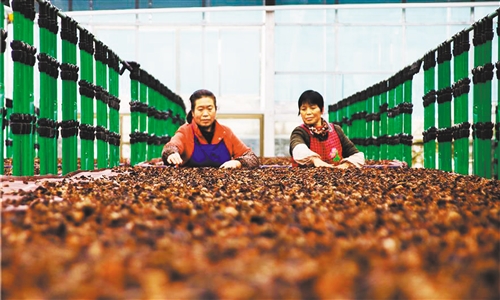 貴州印江木黃食用菌園區(qū)里,農(nóng)民在攤曬黑木耳。 左禹華攝(中經(jīng)視覺)
