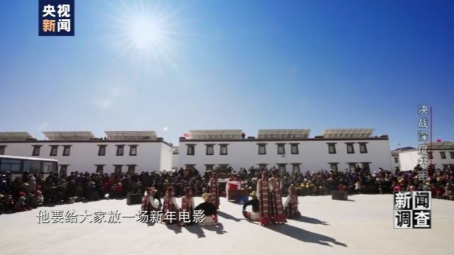 新年前的最后一天,光伏小鎮(zhèn)的廣場上有江當鄉(xiāng)上組織的歌舞演出,全鎮(zhèn)男女老幼都跑出來曬太陽、看熱鬧。鎮(zhèn)上的電影放映員達瓦加布沒有看太久,他要去整理放映器材,如果明天風小了,他要給大家放一場新年電影。