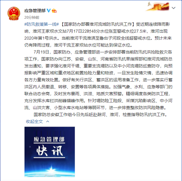 7月19日,國家防辦、應(yīng)急管理部進一步安排部署當前防汛抗洪搶險救災(zāi)各項工作,國家防辦向江蘇、安徽、山東、河南省防汛抗旱指揮部和淮河流域防總發(fā)出通知,要求強化淮河干堤、重要支流堤防以及中小河流堤防巡查防守,向預(yù)報影響嚴重區(qū)域和重點地區(qū)前置搶險力量和物資,一旦發(fā)生險情災(zāi)情,迅速協(xié)調(diào)各方力量有效處置。做好有關(guān)行洪區(qū)、蓄洪區(qū)的運用準備工作,進一步落實行蓄洪區(qū)內(nèi)人員撤退、轉(zhuǎn)移、安置等各項具體措施。加強氣象、水利、應(yīng)急等部門的聯(lián)合動態(tài)會商,及時發(fā)布暴雨、洪澇、地質(zhì)災(zāi)害預(yù)警。精細調(diào)度各類防洪工程,充分發(fā)揮水庫攔洪削峰錯峰作用。針對堤防險工險段、采煤沉陷影響區(qū)、中小河流、山洪災(zāi)害、小型水庫水電站等薄弱環(huán)節(jié),進一步排查整改防洪風(fēng)險隱患。