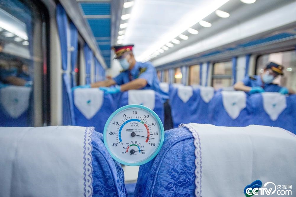車輛駛?cè)虢K點站昆明,整個車輛將會斷電……列車車廂在庫內(nèi)整備將接受烈日的暴曬,鐵皮車內(nèi)的溫度會迅速升高,最高時將近50℃,車內(nèi)熱得像“桑拿房”。暖氣管、潔具柜、車門翻板等隱蔽部位,作為本節(jié)車廂的“守車人”李卿茹必須一一檢查。