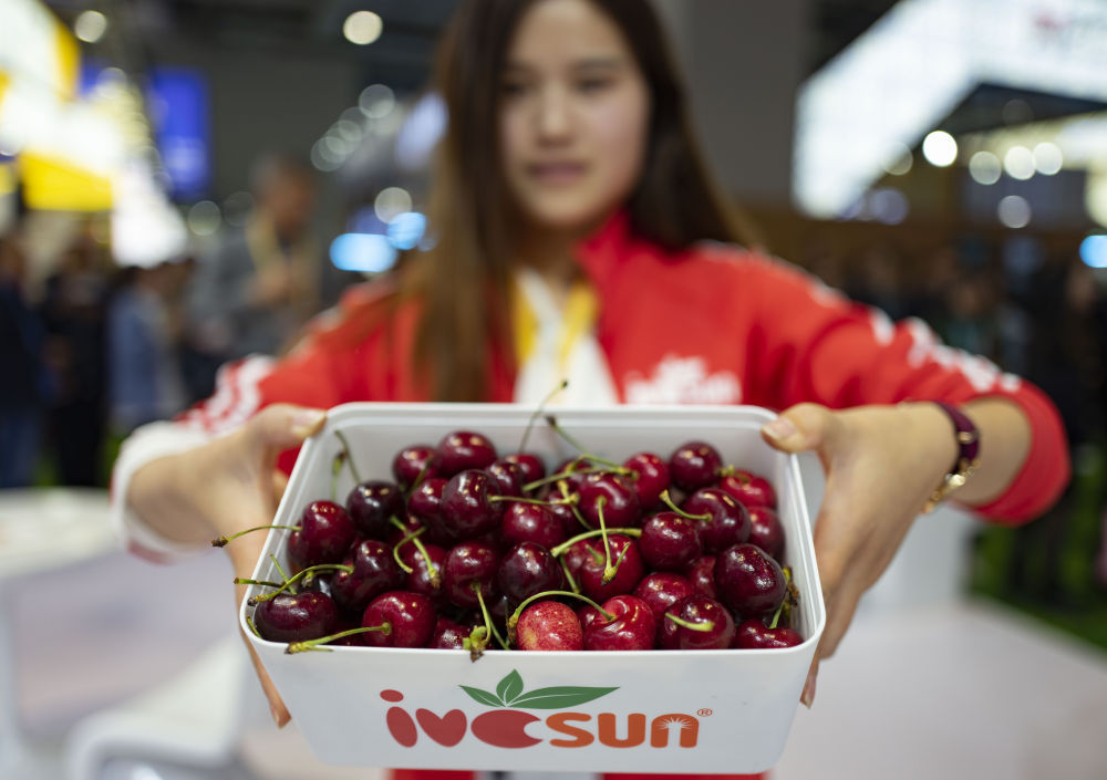▲第二屆進(jìn)博會(huì)上,工作人員在食品及農(nóng)產(chǎn)品展區(qū)展示智利車?yán)遄印?/p>