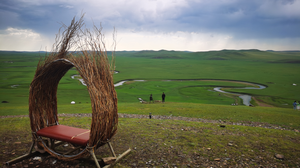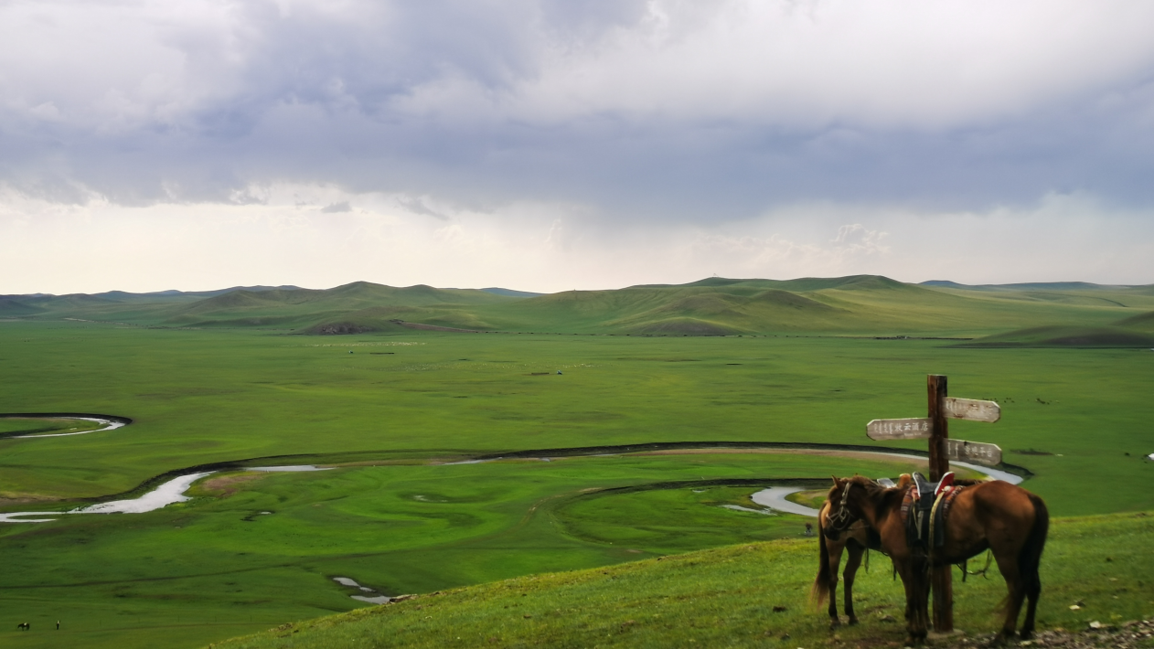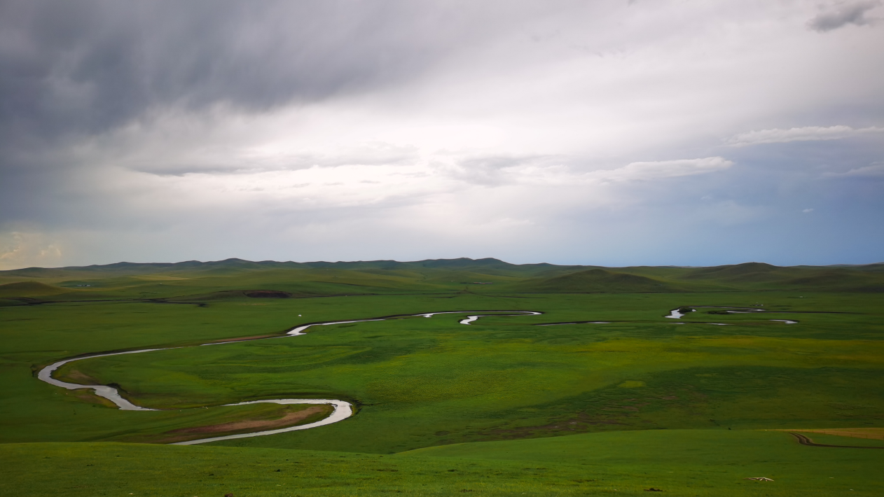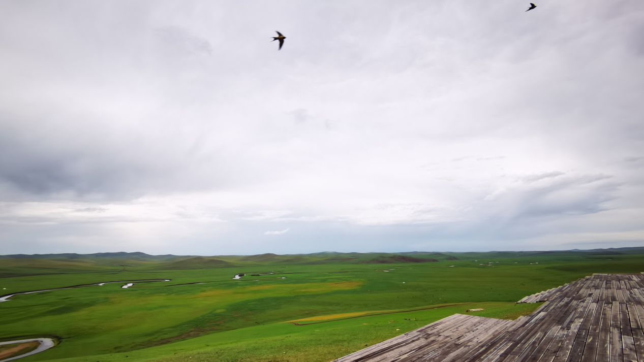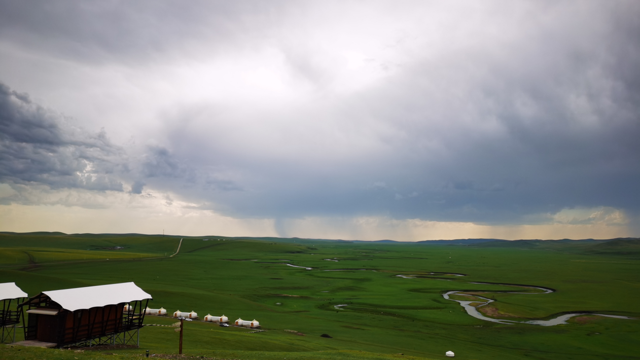 在陳巴爾虎旗鄂溫克蘇木阿爾山嘎查牧云山頂,莫日格勒河如巨龍般盤踞的身影盡收眼底。云層低垂,仿佛和遠(yuǎn)方的草原相連卻又界限分明。