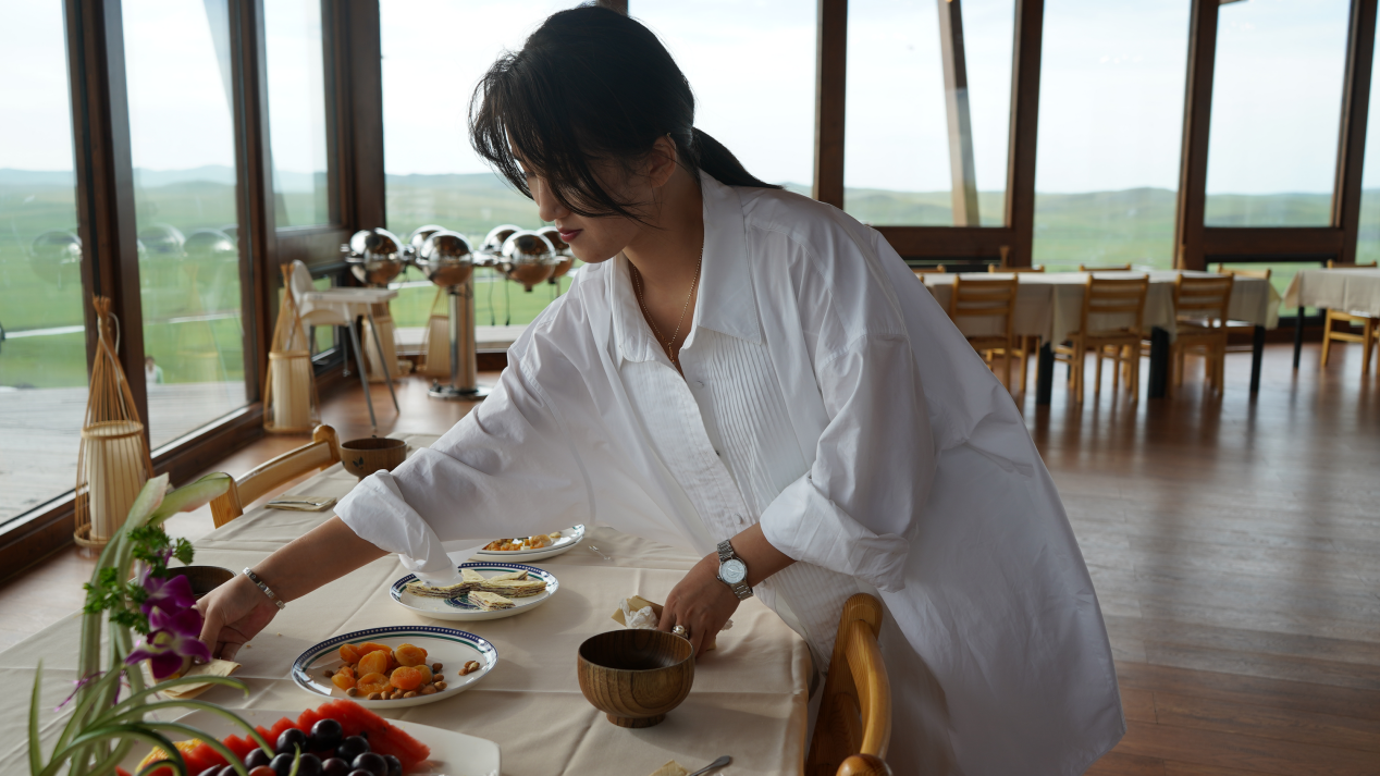 “我們現(xiàn)在一共有17間房,10間蒙古包,加上7間木屋,餐廳是一個(gè)360度的玻璃餐廳”,杜蓉蓉介紹,在這里,游客“仰可觀日出日落,俯可瞰牛羊馬群”,更重要的是,這里提供了一個(gè)讓人們放松心情的場(chǎng)所。原始的蒙古族游牧生活、曠遠(yuǎn)的馬頭琴聲、嘹亮悠揚(yáng)的民歌,足以讓人暫時(shí)將一切煩心瑣事拋諸腦后。