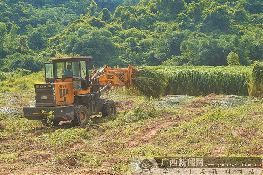 在崇左市龍州縣下凍鎮(zhèn)扶倫村那渠屯甘牛生態(tài)養(yǎng)殖基地,養(yǎng)殖技術(shù)帶頭人在駕駛機(jī)械收割草料。廣西日?qǐng)?bào)記者 何學(xué)俏 攝