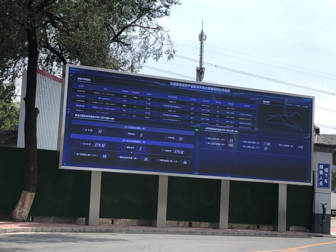 對(duì)于周轉(zhuǎn)新區(qū)來(lái)說(shuō),更值得關(guān)注的是電子技術(shù)的使用。親農(nóng)門入口的大門一側(cè)是一個(gè)內(nèi)部停車場(chǎng),另一側(cè)有一塊高3米、近10米寬的“市場(chǎng)運(yùn)行大數(shù)據(jù)”電子大屏,實(shí)時(shí)更新入場(chǎng)車輛的車牌號(hào)、聯(lián)系人、貨品產(chǎn)地等信息,還包括入場(chǎng)上貨人員的體溫、姓名等。進(jìn)入市場(chǎng)需要通過(guò)人臉識(shí)別,購(gòu)買果蔬的全過(guò)程都要留痕。