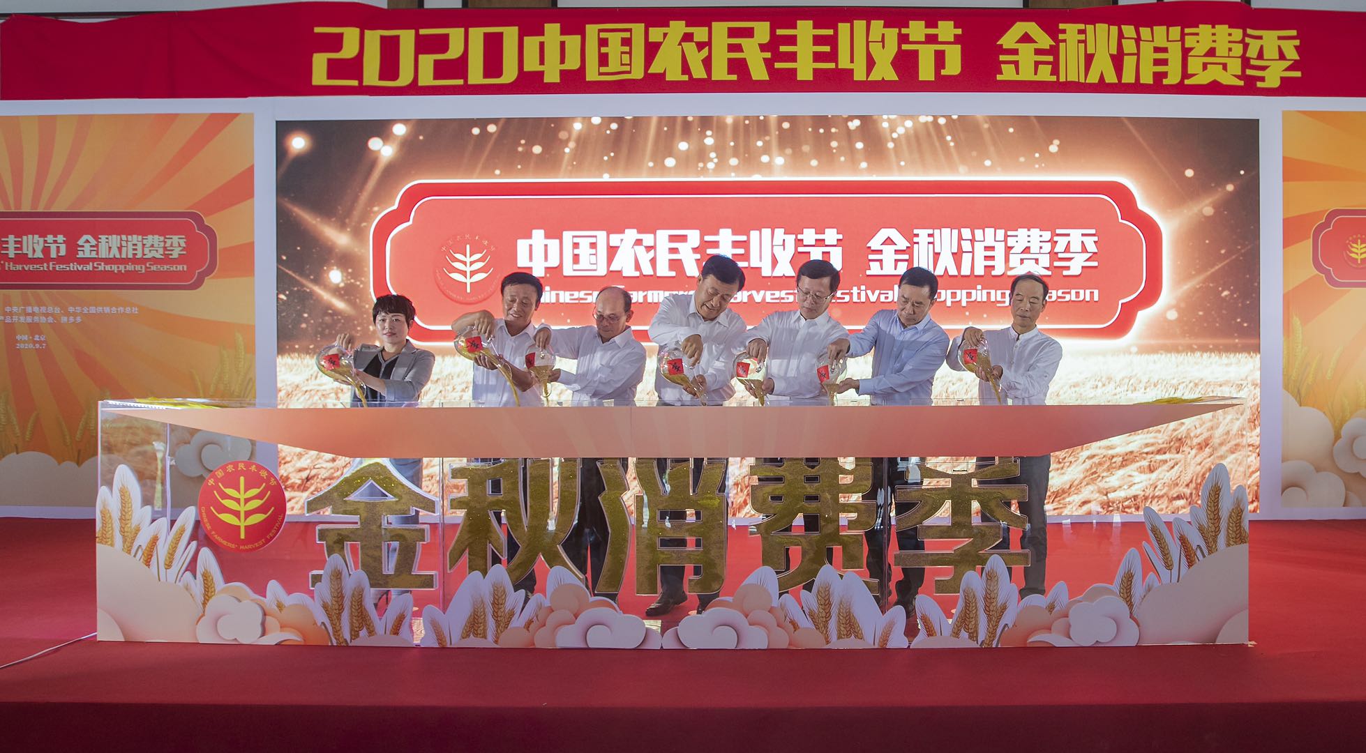 9月7日,由農(nóng)業(yè)農(nóng)村部、中央廣播電視總臺、中華全國供銷合作總社聯(lián)合發(fā)起的2020年中國農(nóng)民豐收節(jié)金秋消費季在北京啟動。農(nóng)業(yè)農(nóng)村部副部長于康震、中央廣播電視總臺副臺長蔣希偉、中華全國供銷合作總社理事會副主任鄒天敬,與三位農(nóng)民代表共同開啟“豐收門”。