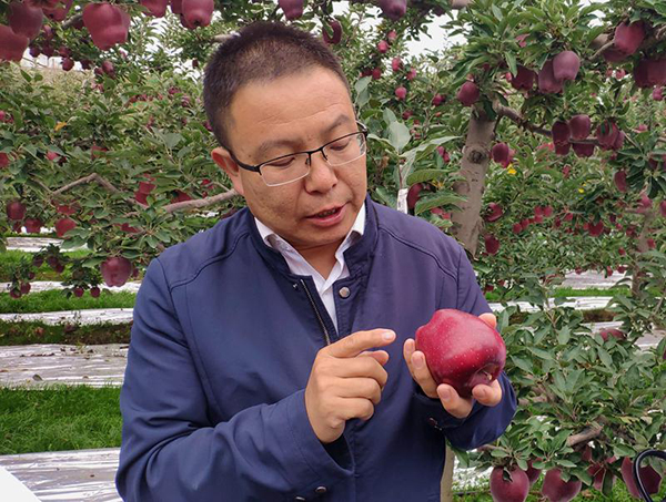 9月19日,甘肅天水麥積區(qū)農(nóng)業(yè)農(nóng)村局果業(yè)中心副主任錢永波向記者介紹花牛蘋果。新華網(wǎng)發(fā) 李雪梅攝