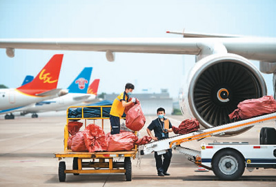 在長沙黃花國際機場,工作人員把跨境電商包裹放置在貨物傳送帶上。