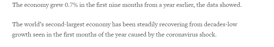 路透社報(bào)道,中國(guó)前三季度GDP同比增長(zhǎng)0.7%,世界第二大經(jīng)濟(jì)體正穩(wěn)步從年初受疫情影響的經(jīng)濟(jì)增長(zhǎng)放緩中恢復(fù)過來。中國(guó)實(shí)施了一系列措施,包括積極的財(cái)政政策、減稅政策以及降低貸款利率和銀行準(zhǔn)備金等,促進(jìn)恢復(fù)經(jīng)濟(jì)、提升就業(yè)。