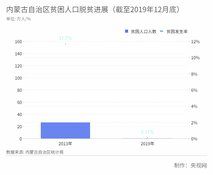 內(nèi)蒙古自治區(qū)的貧困人口從2013年的157萬(wàn)人減少至2019年底的1.6萬(wàn)人,貧困發(fā)生率由11.7%下降至0.11%。截至2020年3月,全區(qū)31個(gè)國(guó)貧旗縣和26個(gè)區(qū)貧旗縣全部退出貧困旗縣序列,實(shí)現(xiàn)貧困旗縣“清零”。