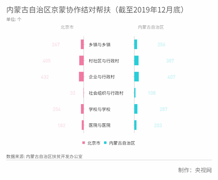 2019年,內(nèi)蒙古31個(gè)旗縣全面實(shí)現(xiàn)了“組團(tuán)式幫扶”,與北京市267個(gè)經(jīng)濟(jì)強(qiáng)鎮(zhèn)、405個(gè)村社區(qū)、432家企業(yè)、32家社會(huì)組織、254所學(xué)校和182家醫(yī)院建立了結(jié)對(duì)幫扶關(guān)系,惠及256個(gè)鄉(xiāng)鎮(zhèn)、902個(gè)行政村、287所學(xué)校和203家醫(yī)院。