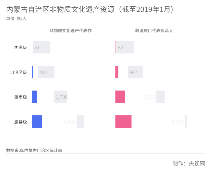 現(xiàn)有人類非物質(zhì)文化遺產(chǎn)代表作2項(xiàng)(世界級(jí));國(guó)家級(jí)非物質(zhì)文化遺產(chǎn)代表性項(xiàng)目81項(xiàng)89處;自治區(qū)級(jí)非物質(zhì)文化遺產(chǎn)代表性項(xiàng)目487項(xiàng)820處;盟市級(jí)項(xiàng)目1736項(xiàng);旗縣級(jí)項(xiàng)目3484項(xiàng)。有國(guó)家級(jí)非遺項(xiàng)目代表性傳承人82人,自治區(qū)級(jí)傳承人967人,盟市級(jí)傳承人3165人,旗縣級(jí)5399人,基本實(shí)現(xiàn)了全區(qū)非物質(zhì)文化遺產(chǎn)代表性項(xiàng)目及其代表性傳承人的分級(jí)保護(hù),并開(kāi)展了對(duì)元上都遺址、大窯文化遺址、紅山文化遺址、陰山巖刻遺址、遼上京遺址等重點(diǎn)文物保護(hù)單位的保護(hù)工作。