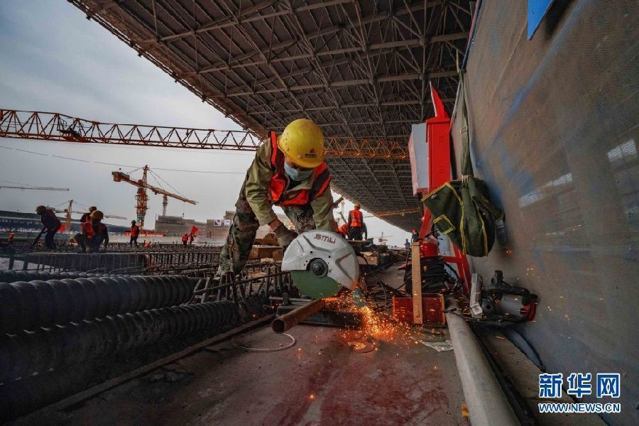 ↑3月12日,在成都天府國際機(jī)場T1航站樓的施工現(xiàn)場,工人正在按尺寸切割鋼管。 劉應(yīng)華 攝