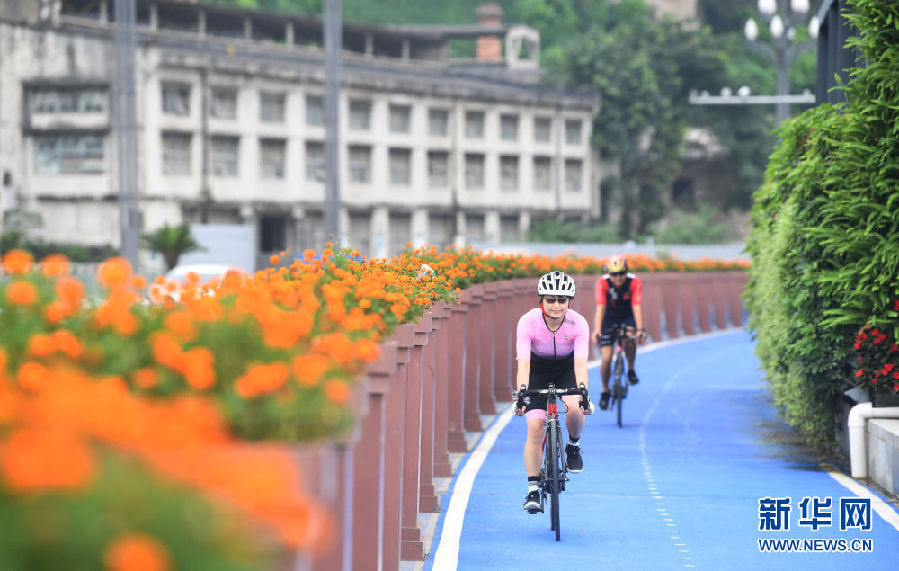 ↑7月23日,市民在重慶市江北區(qū)北濱路漫行步道的自行車道上騎行。 新華社記者王全超 攝