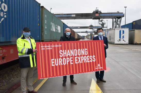 △馬特恩(左)2020年4月30日在漢堡港貨運(yùn)場(chǎng)站與中國駐漢堡總領(lǐng)事杜曉暉、漢堡市經(jīng)濟(jì)部長韋斯特哈格曼共同迎接首趟濟(jì)南至德國漢堡中歐班列的抵達(dá)(來源:漢堡港營銷協(xié)會(huì))