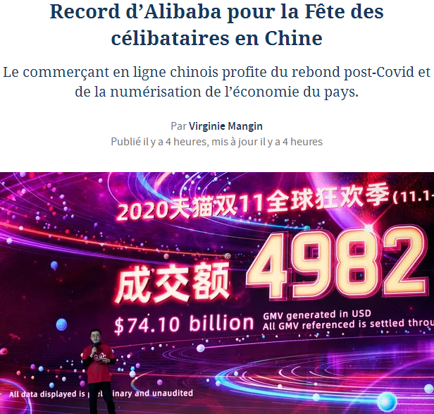 11月12日,法國《費加羅報》報道稱,受益于中國新冠疫情后的消費反彈以及數(shù)字經(jīng)濟的發(fā)展,中國電商阿里巴巴旗下天貓“雙11”銷售規(guī)模再破記錄。報道認(rèn)為,“雙11”現(xiàn)在已逐漸成為中國經(jīng)濟的“晴雨表”。